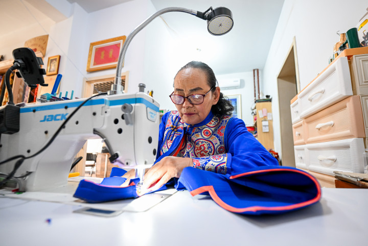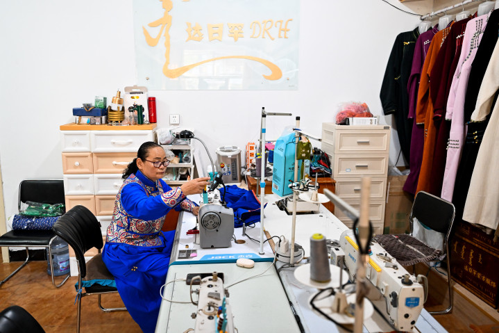 9月26日,通嘎拉嘎在店内缝制蒙古袍。新华社记者 李志鹏 摄