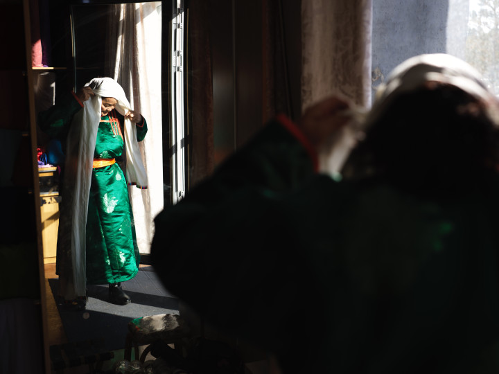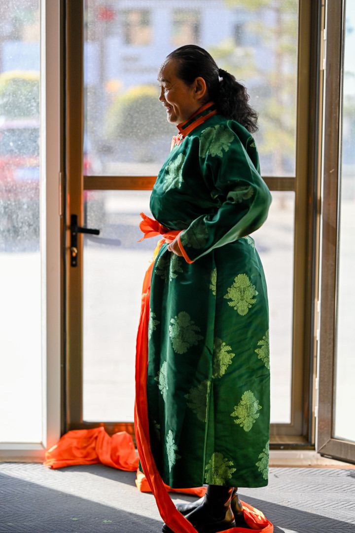 9月26日,在服装店里,通嘎拉嘎穿上自己制作的蒙古袍,准备去参加苏尼特左旗的民族团结进步表彰大会。新华社记者 刘金海 摄