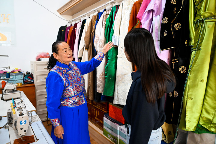 9月26日,在服装店里,通嘎拉嘎穿上自己制作的蒙古袍,准备去参加苏尼特左旗的民族团结进步表彰大会。新华社记者 连振 摄