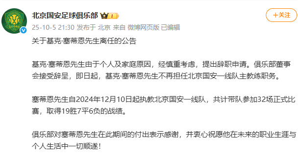 10月5日晚泸深在线,北京国安俱乐部官方宣布:现任主帅塞蒂恩离任,球队暂时由助教团队负责指挥。