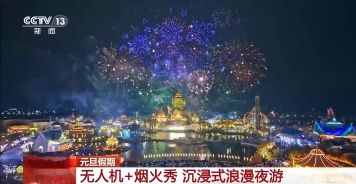 这个元旦假期,江苏淮安的西游乐园,推出了无人机表演、烟花秀以及民俗巡游、打铁花等表演。夜幕降临后,2000架无人机矩阵,在天空中变化出策马奔腾、马到成功、好运锦鲤等造型,吸引了不少游客聚在湖岸边驻足观赏。